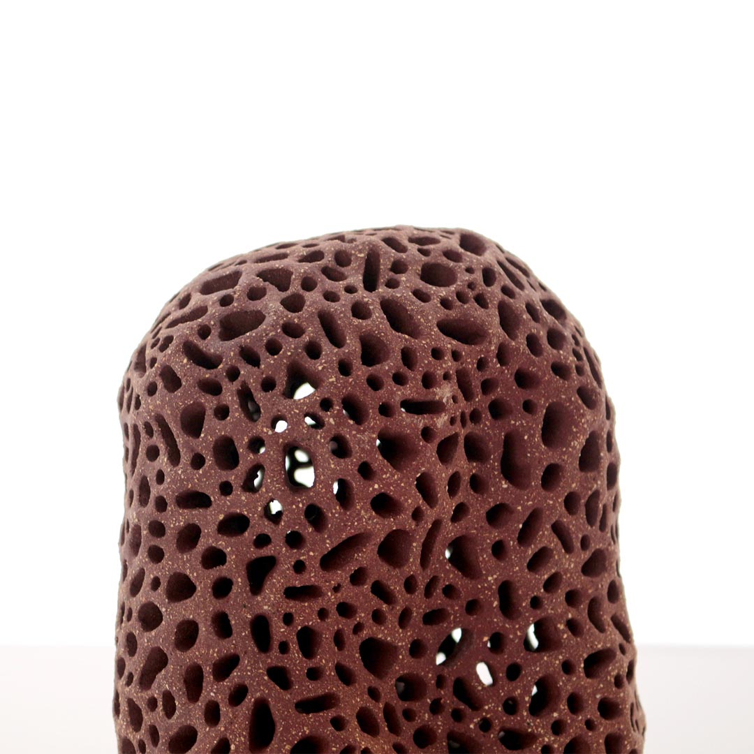 Elaborada en gres porcelánico con chamota roja oscura, «CUMBRE VIEJA» es una escultura que evoca la poderosa belleza de las erupciones volcánicas.