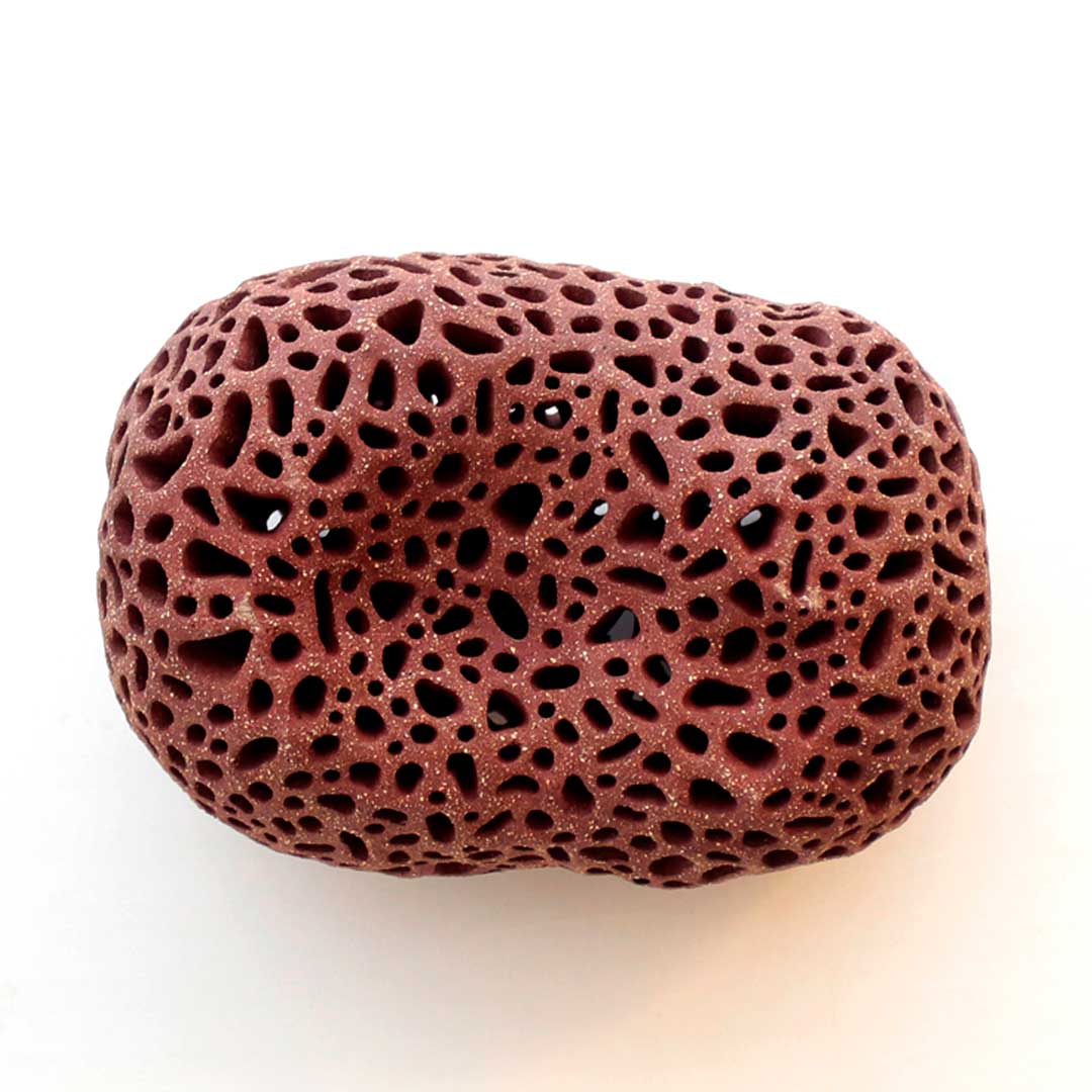 Lo que caracteriza a “CUMBRE VIEJA” es su fascinante y porosa estructura, reminiscente de la roca volcánica. Sus múltiples perforaciones, distribuidas de forma orgánica, no solo aligeran visualmente su volumen, sino que también invitan al observador a explorar sus profundidades, creando un dinámico juego de luces y sombras.