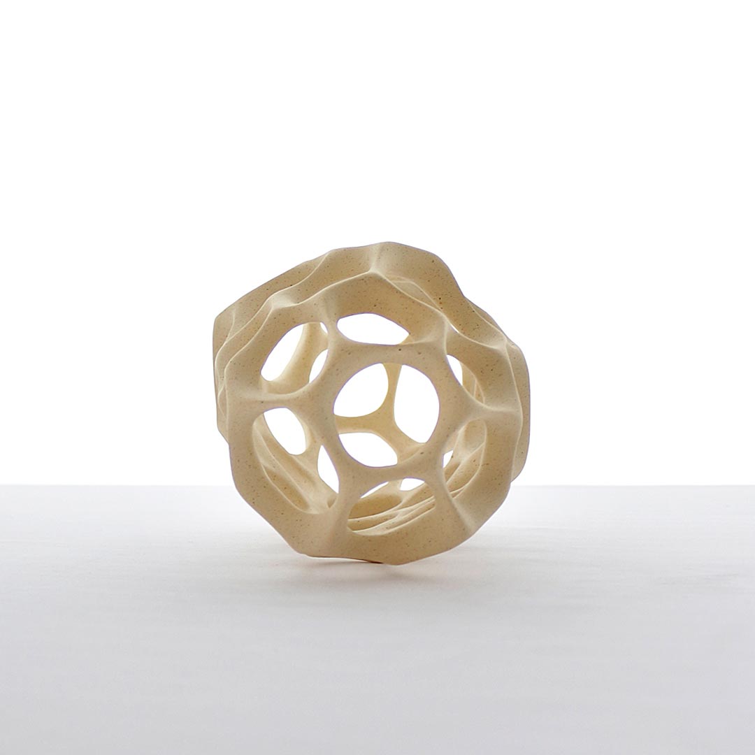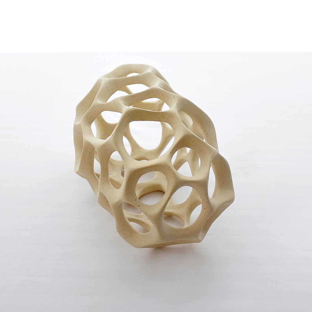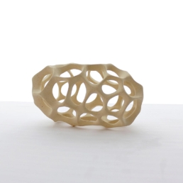 Lo que caracteriza a «EXO» es su fascinante estructura calada y orgánica, que evoca la complejidad de un exoesqueleto natural o formaciones porosas de corales y rocas volcánicas. Sus perforaciones, cuidadosamente distribuidas, definen su volumen e invitan a explorar el espacio negativo, creando un juego de transparencias y opacidades.