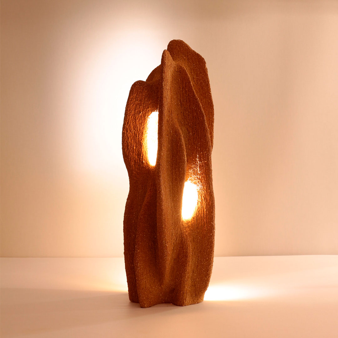 Lo que distingue a “PUNSO” y la eleva de una simple escultura a una pieza funcional de arte es su diseño pensado para poder integrar luz interior. Esta característica transforma la obra al anochecer, permitiendo que la luz emane suavemente desde sus aberturas, creando un juego hipnotizante de luces y sombras.